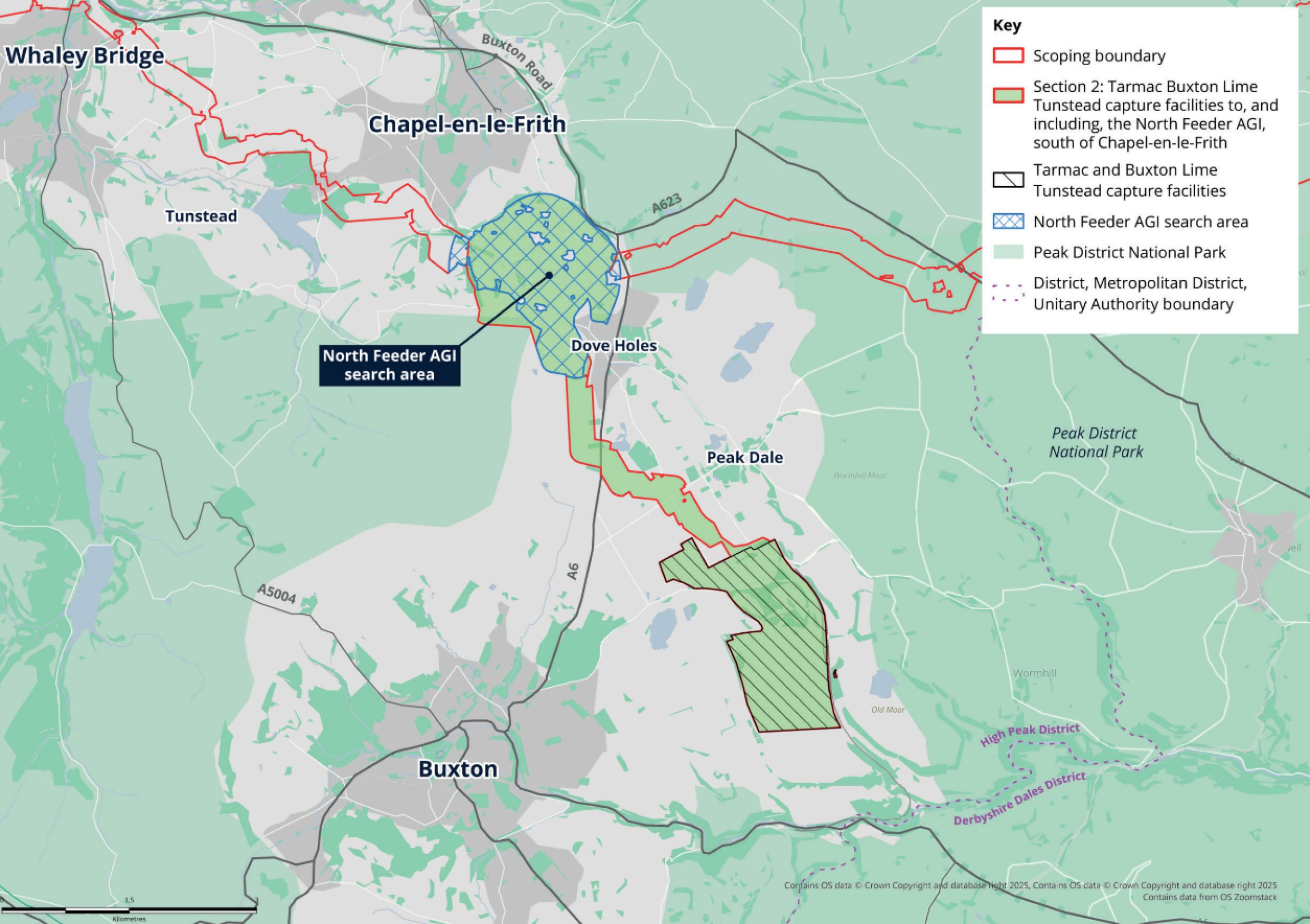 Section 2 includes the Tarmac Tunstead Cement Works capture facility Tarmac Tunstead CCS, and the Buxton Lime capture facility, Buxton Lime CCS located at Tarmac’s Tunstead site, to the north east of Buxton, in Derbyshire. This section also includes the North Feeder AGI, located to the south of Chapel-en-le-Frith, and the pipeline connecting the capture facilities to this.