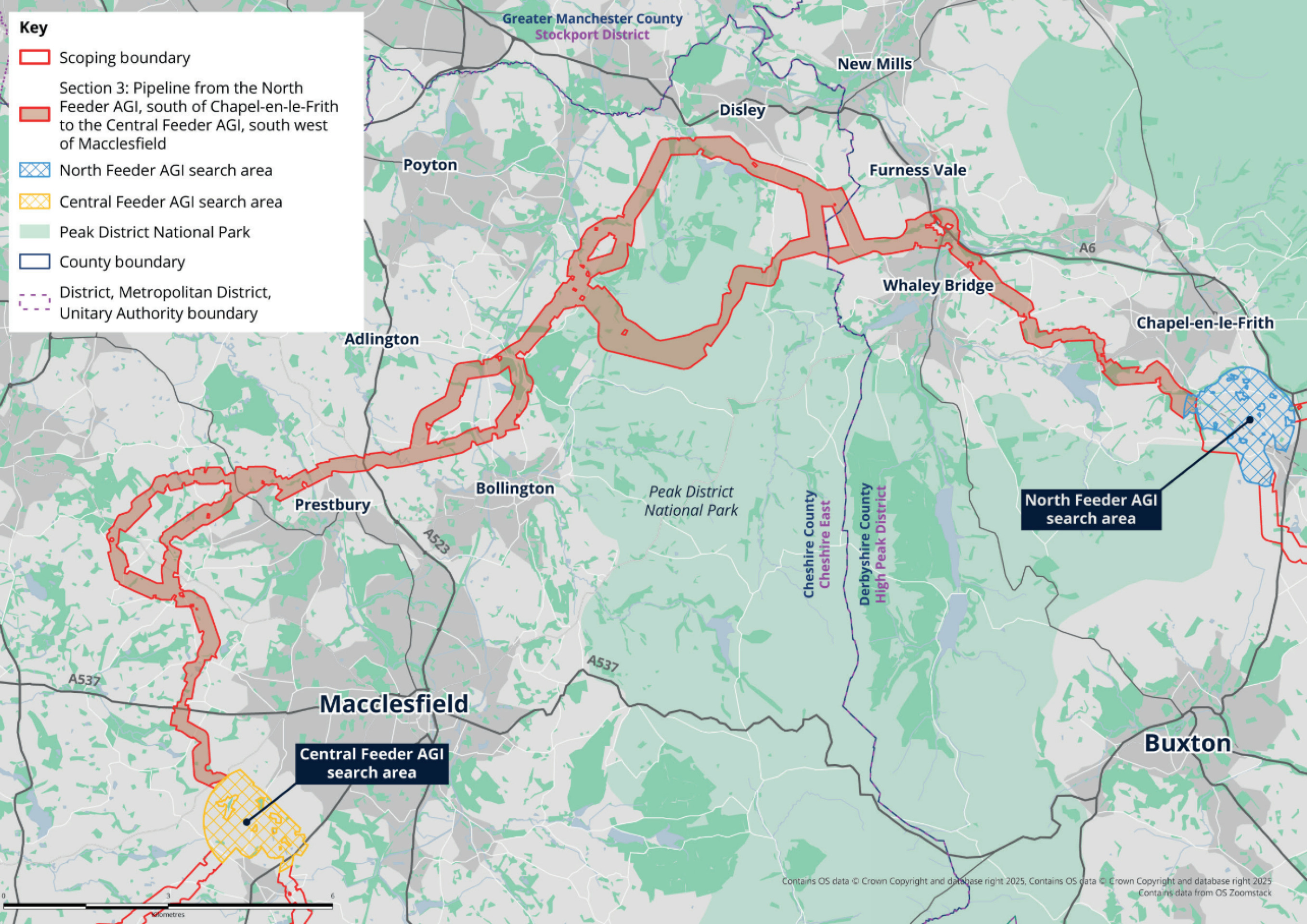 Section 3 includes the pipeline which runs from the North Feeder AGI, located to the south of Chapel-en-le-Frith in Derbyshire, through to the Central Feeder AGI, south west of Macclesfield.