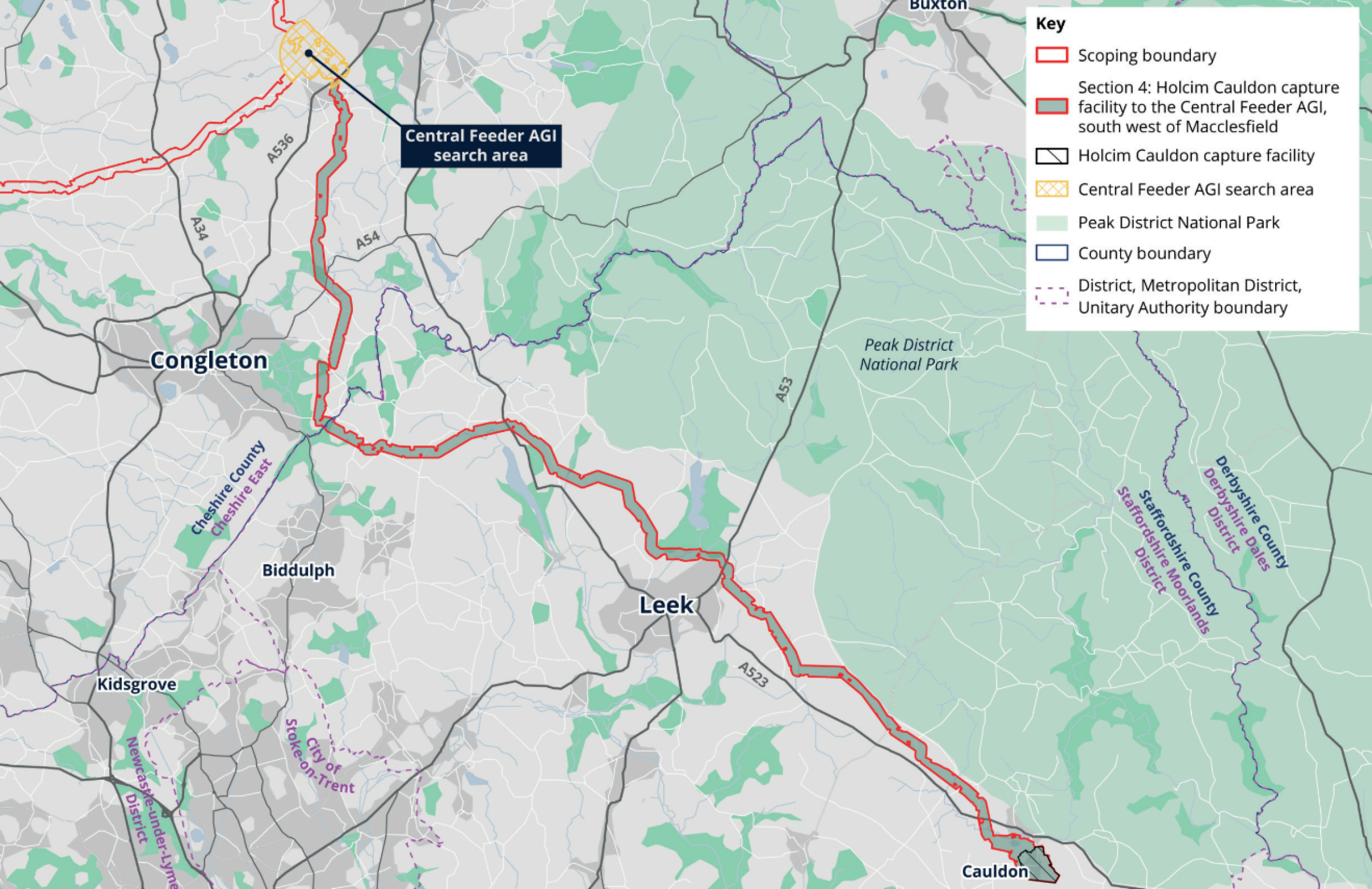 Section 4 includes the Holcim Cauldon capture facility Holcim Cauldon CCS, located near Cauldon, Staffordshire, and the pipeline which passes north of Leek and Congleton, before it reaches the Central Feeder AGI, south west of Macclesfield.